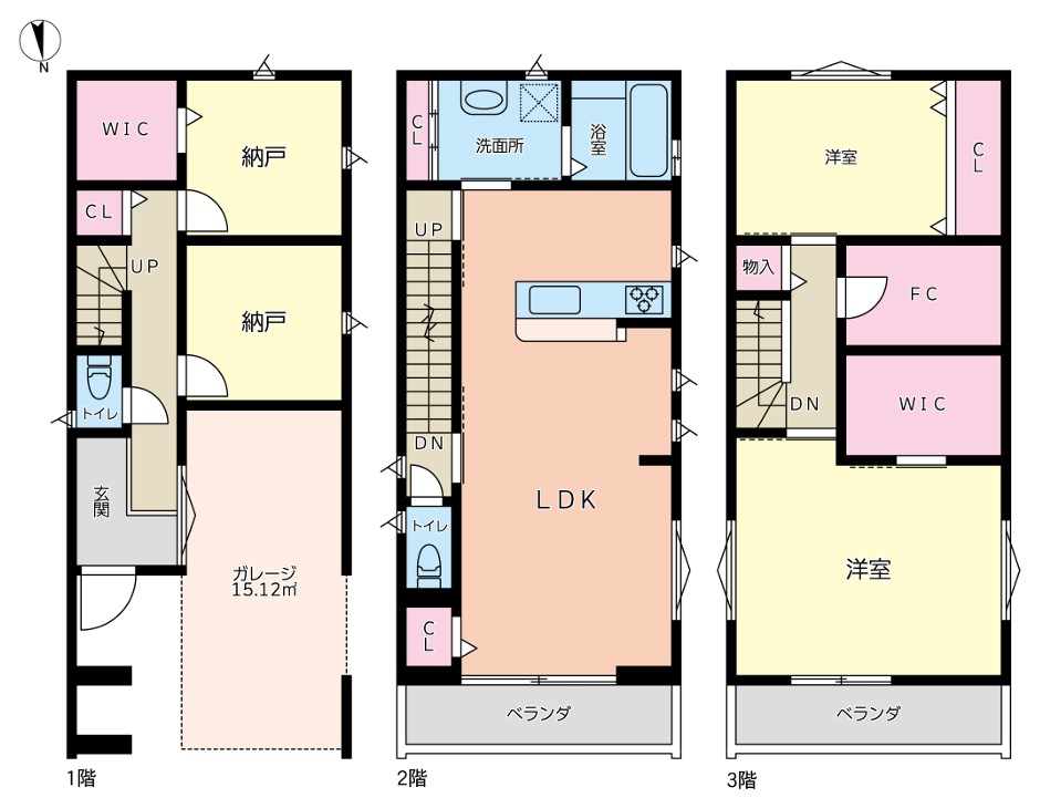 面積:140.85㎡(1階47.79㎡、2階46.53㎡、3階46.53㎡)